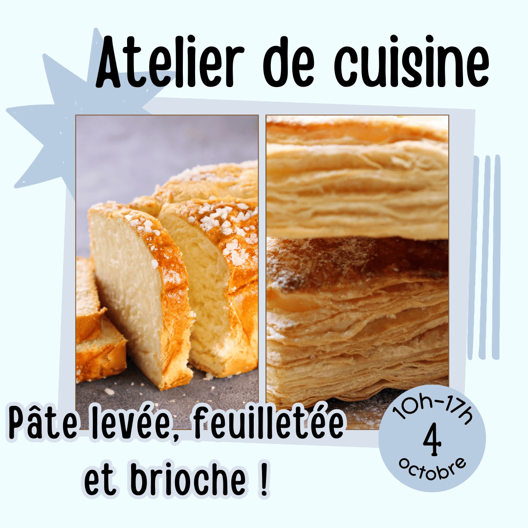 Apprenez les techniques pour réaliser vos futurs pâtisseries et brioches. Ce 4 octobre, dés le matin, nous préparerons les pâtes que nous laisserons « pousser » le temps d’un déjeuner partager. Puis nous reprendrons l’atelier pour finaliser la pâtes sablée & réaliser les brioches.